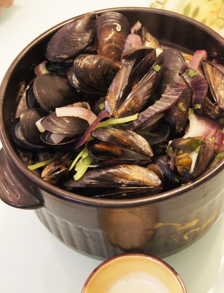 西式煮海虹是一道美食,主要食材是青口、红皮洋葱、芹菜等。