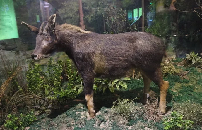 敏陈苏门羚:又名鬣羚,国家二级重点保护动物。也被陕西人称之为 "陕西四不像",与骡、羊、牛、羚、马等众多常见的食草动物都有些相像,但又都不太像。毛色较深,以黑为主,杂有灰褐色毛。