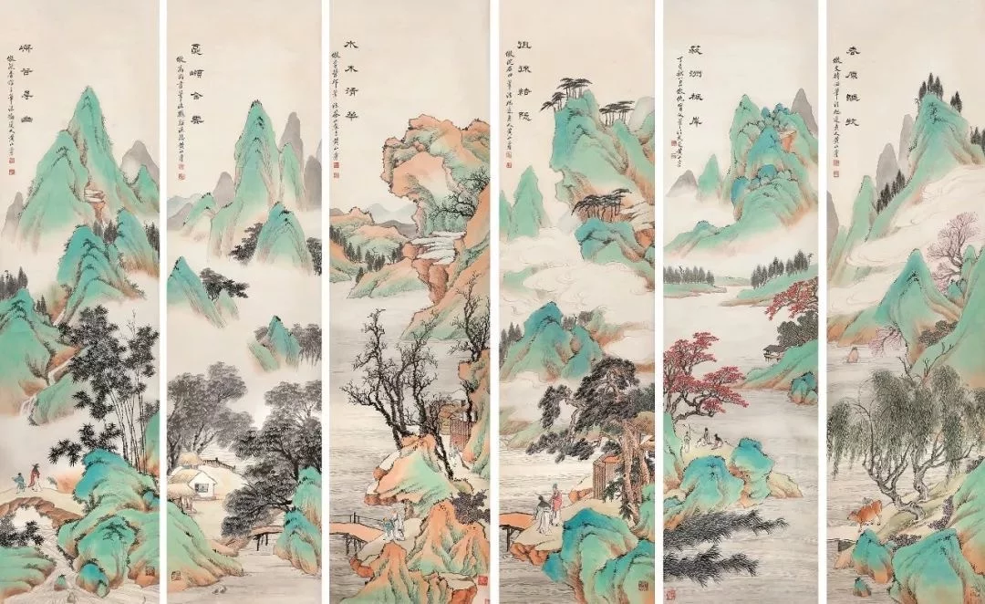 转载请注明出处安可林文章网 » 清杨伯润,倪田,何维模,黄山寿设色山水屏