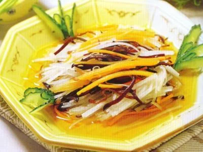 (1)白萝卜、红萝卜去皮切细丝,水发木耳云蒂切丝。
