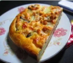 6、铺上炒过的蘑菇片。铺上炒过的鸡肉丁。撒上剩余的马苏。烤箱120度预热,烤20分钟。