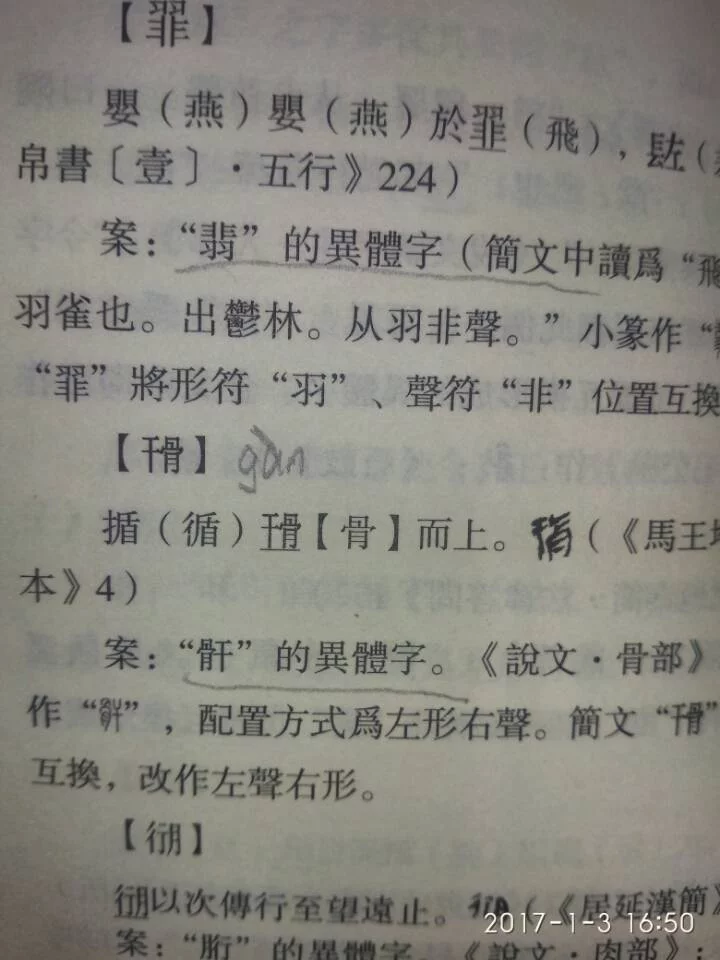 《唐韵》古案切《集韵》《韵会》居案切,ࠀ�音干。《尔雅·释训》骭疡为微。《注》骭,脚胫也。《说文》骸也。《广韵》胁也。《宁戚·饭牛歌》短布单衣适至骭。《九经韵览》亦作干。