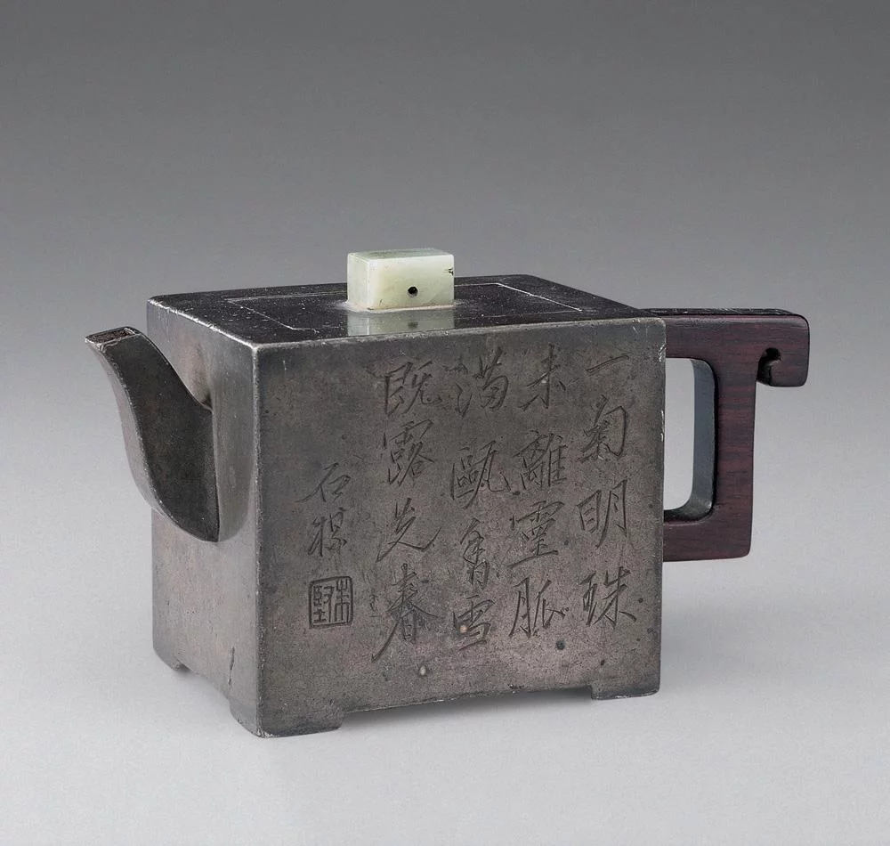 壶作方形,锡质。配玉质方钮,短流,镶紫檀嵌银丝"道光元年石父制"把。来自一面浅刻梅花图,一面刻有"一幻明珠未离灵脉,满瓯香雪既露搞先春。石楳。"落"朱坚"方章款。壶内底刻有"仿古"二360百科字。