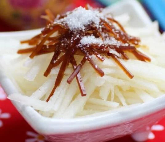 糖梨丝是一道美食,制作材料有来自山楂糕 300克,白糖、醋、香蕉精适量。