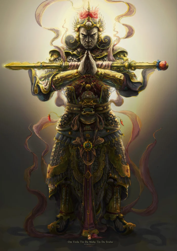 韦驮尊天菩萨在多部经典中,发愿扶持佛法和学习佛法的人。如此大愿使菩萨成为佛教护法神的代表,故责任重大。