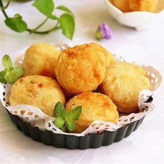鲜肉油墩子是上海有名的大众化点心,是由上海点心师首创,采用鲜肉、荠菜和萝卜丝为馅,加面浆经炸制而成。