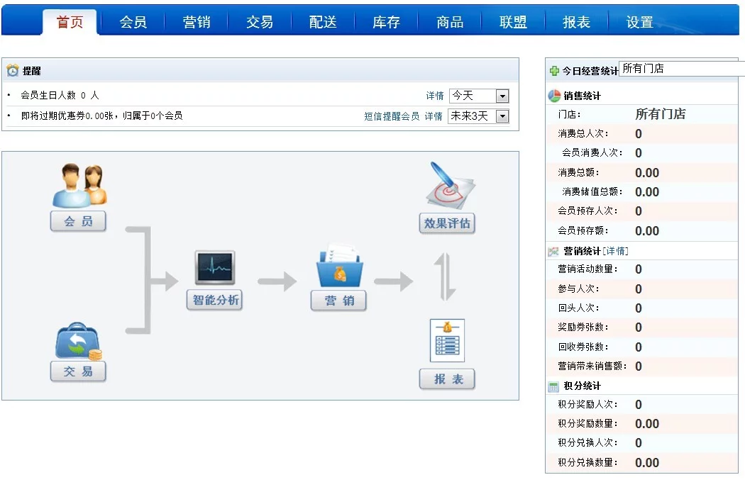 进行会员管理和营销活动的网络界面,商户可以进行会员管理、进行精准营销活动、管理营销活动、查看报表。
