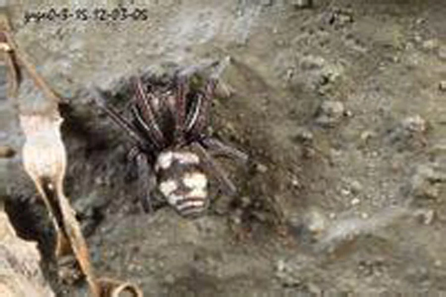 日本崖地蛛,体长4-8mm,雌蛛通体黑色,仅于腹背有3-4列白色八字型斑纹,