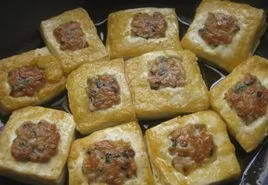 10、不沾锅加少许油加热后放入豆腐两面煎黄即可(豆腐可用香菜叶和红辣椒粒装饰)。煎好的豆腐从中间剖开,夹入炒好的肉末即可