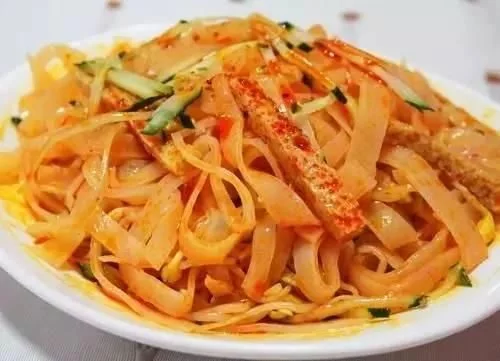 面精又叫"酿皮",内蒙古巴彦淖尔的一道地方特色小吃,是一种用面粉做的凉食佳品。