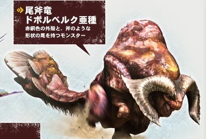 尾斧龙--来自多波尔贝尔克亚种(ドボルベルク亚种)是热门游戏怪物猎人3期意给G(3DS)中登场的虚构怪物,为兽龙种怪物尾锤龙的亚种。栖息于砂原,是脾气火爆的大型草食动物。全身覆盖赤铜色的皮甲,尾骨延展成斧头状便于挖地,挥动尾巴时能卷起沙暴,被称为"砂原巨斧"