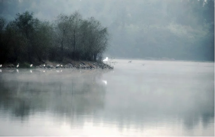明代李崇谦《东湖漫兴》:三月湖边春色赊,东风开遍碧桃花。香分野岸围成锦,影入清波带作霞,静听黄鹂鸣灌木,闲看白鸟浴晴沙。胜游一似武陵客,何处仙家饭熟麻。