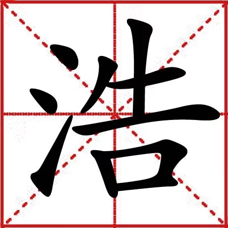 ◎ 水大,引申为大和多:~大。~繁。~荡。~瀚。~劫。~淼(亦作"浩渺")。~气(盛大刚直之气)。~如烟海,浩然正气。