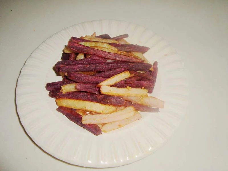 双色薯条是一道美食,不含防腐剂,原料有土豆、紫薯。