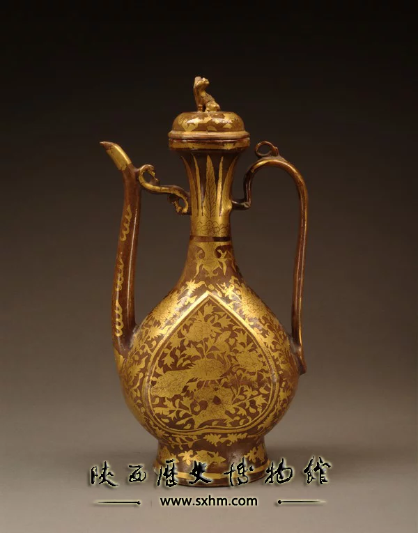 酱釉描金孔雀牡丹执壶是明代景德镇仿照波斯铜壶烧造的,应为一件外销产品。