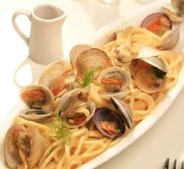 4、趁热将意粉与黄油、奶油奶酪混合拌匀,调入适量盐、胡椒粉;加入切碎生洋葱丁、淖水后的西兰花、切碎培根丁、茄汁焗豆及1中的文蛤和2中的虾,撒上少许风干碎迷迭香拌匀。