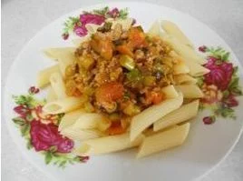 意大利空心面 150g、番茄1个、油1大勺、盐2勺、番茄酱1大勺、鸡精适量、肉末适量、四季豆适量、黑木耳适量、小葱适量。