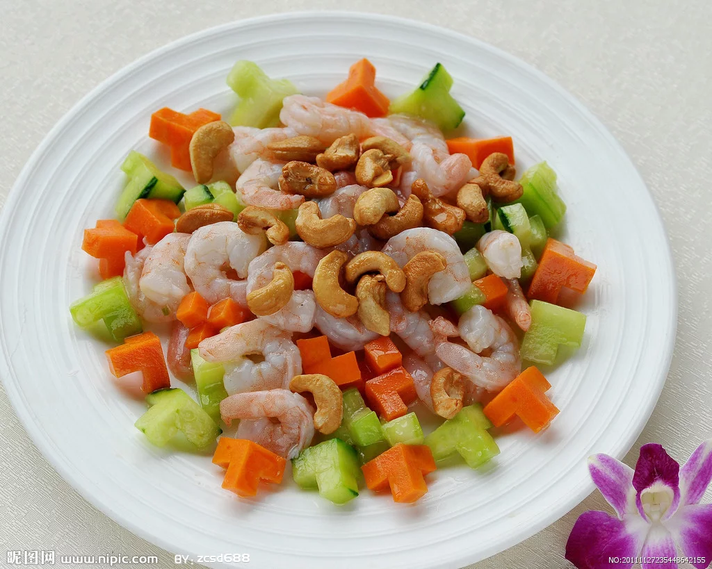- 主要食材 腰果、虾仁、黄瓜、胡萝卜等