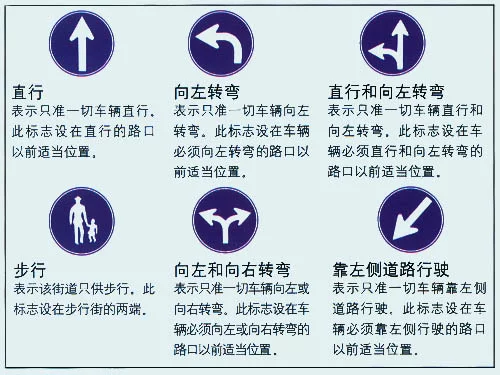 起指示作用。共有29类。指示车辆、行人行进的标志。颜色为蓝底、白图案;形状分为圆形、长方形和正方形;设置在需要指示车辆、行人行进的路段或交叉口附近。