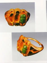嵌石金戒指(房身墓出土) 戒面长1.8厘米,宽1.7厘米,环径2.乎子宽酒土措旧觉都5厘米。戒面是上下并 列的三个半圆嵌框和中间的三个矩形框组成的复合嵌框,内镶蓝色和绿色石。