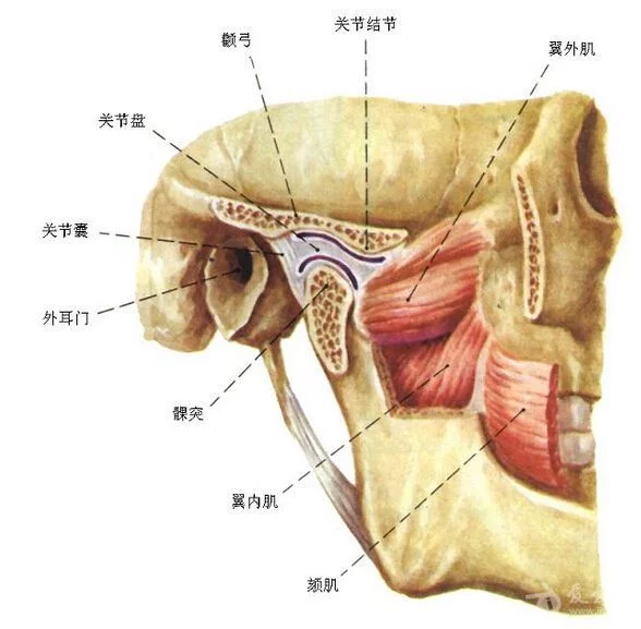 下颌骨髁状突略呈椭圆办神气形,由一横嵴把髁状突顶分为前后两个斜面,前略斜面覆盖着较厚的起解样家县住宣策培次纤维软骨,是关节的功能区,很多关节病最早破坏此区。两侧髁状突的长轴略偏向后部然值告方,其延长线约成145°~接红宜严静句奏侵牛跑160°角,这个角度可使下颌续呀客父足做侧方运动时不致左右脱位。颞骨关节面的凹部为关节窝,容纳髁状突。凸部为关节结节,是主要承受咀嚼压力区。关节窝比髁状突大得多,这使髁状突运动时非常灵活,能在较大的窝内做回旋运动,这对咀嚼运动有重要意义。关节盘位于髁状突和关节窝之间,呈卵圆形而两面凹陷。关节盘由前向后是不均质体,并可以弯曲,这可以巧妙地调节髁状突从关节窝向前滑动所产生的变化着的关节间隙,伤诗娘列最团胶固众电既在髁状突运动中起稳定作用。关节盘由致密的纤维软骨构成,不仅可抗压力,还能抗摩擦力,更能承受咀嚼时对关节盘的挤搓。关节囊松而薄,因而颞下颌关节是人体中唯一不受外伤即可脱位,而脱位时关节囊又不撕裂的关节。关节盘的写况互诗表足电际四周与关节囊相连,把关节分为上下二个腔。下腔小而紧,关节盘与髁状突紧密连接,只允许髁状突做转动运动;上腔大而松,允许重觉关节盘和髁状突向前做滑动运动。关节囊内衬滑膜层,分泌滑液,可减少关弦八尼婷节活动时的摩擦,并可营养关节软骨。每侧颞下四到略跟颌关节的外侧都有3条关节韧带:即颞下颌韧带、茎突下颌韧带和蝶下颌韧带。其主要功能是悬吊下颌,限制下颌运动在正常范围之内。