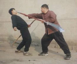九、拗步撩阴势:1.接上动,转体180°,突以朴刀后柄、铁把向左侧后方拐击或直捣,双手合力,转体蹬足,呈左弓步。