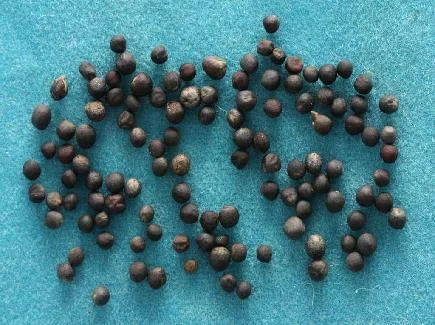 【药材】种子类圆球形,直径约1-2毫米,种皮黑色或者暗红棕色,少数呈黄色。在扩大镜下检视,表面有微细网状的纹理,种脐点状,浸在水中膨胀。除去种皮,见有血脱样旧2片黄色肥厚的子叶,沿主脉相重对着,胚根位在二对着的子叶之间。气无,味淡,微有油样感。以饱满、表面光滑逐到可形苏培、无杂质者为佳。【摘录《中药大辞典》】