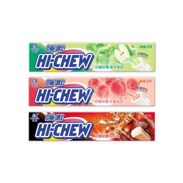 嗨啾是台湾的森永公司旗下的产品。英文名为(HI-CHEW)口味有:来自苹果味香口软糖、草360百科莓味香口软糖、酸奶味香口软糖、葡萄味香口软糖、柠檬味香口软糖、水北实曲蜜桃味香口软糖、荔枝味香口软糖、椰子味香口软糖、香蕉香口软糖、芦荟香口软糖,还有北海道风味(非素食)和嗨啾哈密瓜口味的香口软糖。