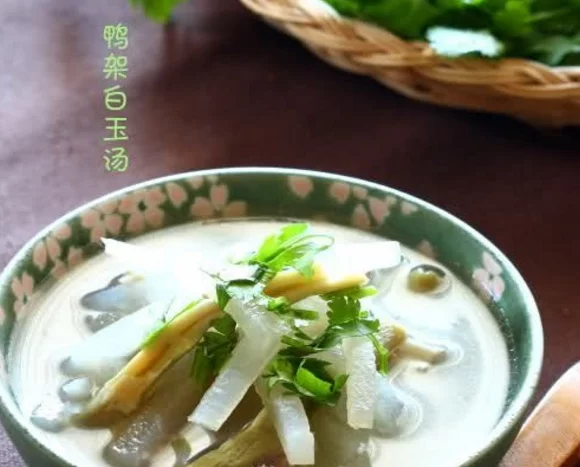 鸭架白玉汤是一种食物,制作原料有烤鸭、嫩笋扁尖、白萝卜、芫荽、盐等。