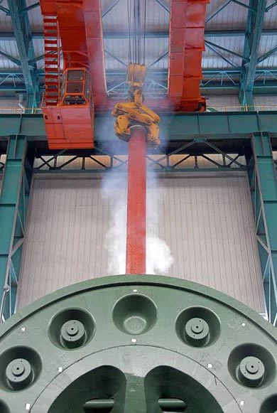 负责指挥制造的中国兵器工业集团北方重工公司副总经理雷丙旺对记者说,3.6万吨垂直挤压机打破了锻压设备传统的设计理念和方法,在多个方面实现了技术突破:一是采用预应力钢丝缠绕结构,提高压机主要承载机架、主工作缸等主要承载部件的疲劳寿命。二是采用预应力坎合结构,控制零件单重,降低制造、运输难度。三是采用下传动,以增强设备的稳定性。四是采用成熟的42MPA大流量泵,直接传动,传动简捷可靠,易于维修保养。液压传动介质采用矿物油,以利于先进泵、阀技术的应用。