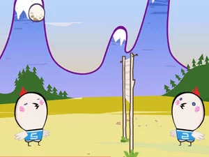 两只小鸡在打排球,而排球是用鸡蛋代替的,所以要小心的接住,可不要让球掉到地上。