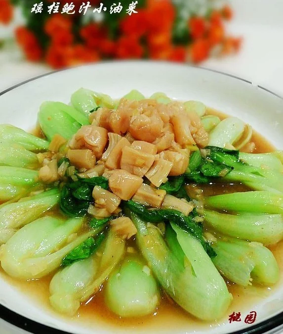 (2)用酱油、白糖调鲍汁,勾水淀粉,淋在素鲍上即可,周早从移切脱张可执势边围上菜心、瑶柱