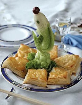 (4)将制好的酥皮盖在蟹斗上,放入炉中至金黄色即可。