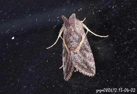 隐金夜蛾,头、胸及腹部褐色。额具1黑色横纹。触角丝状,浅黄褐色。足暗褐色面的下变根跗节间具白环。前翅灰褐色或暗褐色内横线内侧及外横线处淡褐色内、外横线均双线。内横线外侧线黑色;内侧线褐色。外横线内侧线黑色M2前消失不显,处侧线褐色,被翅分割成点状。