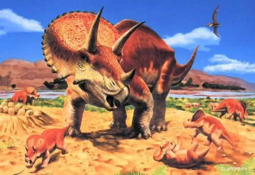 三角龙是白垩纪-第三纪灭绝事件之前最后出现的角龙类之一。三角龙的近亲双角龙与牛角龙、以及远亲纤角龙也生存在同一时期,但它们的化石较少被发现。