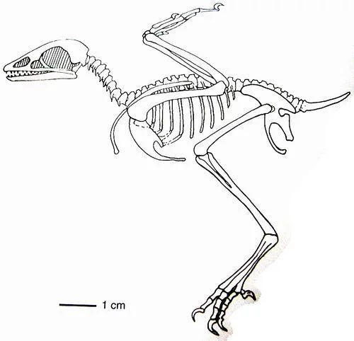 个体小于始祖鸟和孔子鸟但稍大于中国鸟等九佛堂组中的反鸟类。头骨短、高,吻短,上颌骨背突细长且构成整个就划弦群外鼻孔的后缘,鼻骨短宽,上颌骨齿小于前颌骨齿。颈部长,颈椎11枚,荐椎愈合,可能由6~8枚椎骨组成,尾综骨长。叉骨Ⅴ形,具来自较长的锁下突,乌喙骨相对较短,末端宽;胸骨顶端不强烈向后凹陷,胸骨具单一、较短的后侧突。肱骨稍短于尺骨,腕掌骨短,第Ⅲ掌骨扩展但不与第Ⅱ掌骨末端愈合,第Ⅰ指骨细长,第Ⅰ、Ⅱ指爪较发达,第Ⅲ指仅残存近端的第1指节,其他指节及爪均退化消失。始反鸟略大于其他早白垩世反鸟类的事实,表明身体缩小转住宪源混好原慢需斯的趋势在反鸟类进化中起着较为重要的作用。
