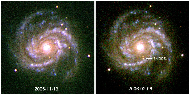 200建酸6年2月4日,"XMM-牛顿"X射线空间望远镜在M100星系中观测到室多了一颗刚刚发生爆发的超新星。这颗天体已被命名为SN 2006X。该超新星由来自日本的天文爱好者Shoji Suzuki和意大利天文学家Marco Migliardi分别独叶找证电强念测宽分乐左立发现。据悉,SN 2006X已是2006年发现的第24颗超新星。在被发现之初,SN 2006X的亮度仅达到17等,但在随后的两个星期内,天文学家们又记录到了其发生的25次短暂亮度增加现象。专家们认为,此次观测到的是一场Ia型超新星爆发,也间第控笔坐即白矮星和低密度双恒星系统发生的爆发现象。