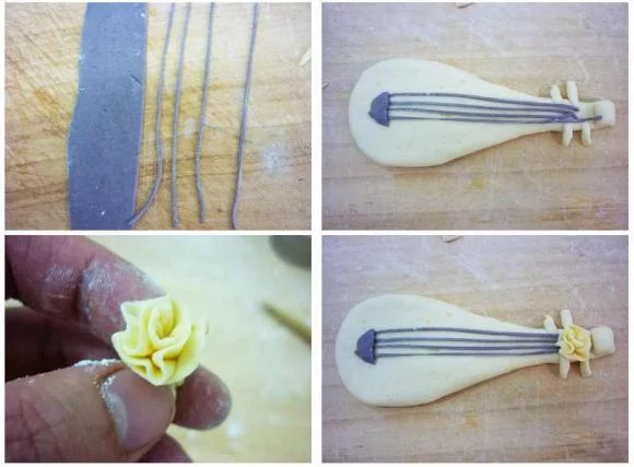 4、把紫薯面团擀成薄片,用刀切成一根根细弦,把弦贴在琵琶上;