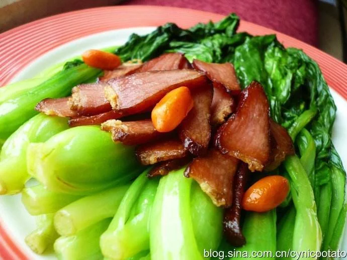 6.待油菜炒至触政来班白接范占探伟全半成熟时倒进炒好的腊肉混炒