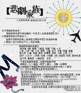悲剧家族来源于绵羊酱的一句话【人生就是悲剧】所以悲剧家族就这样诞生了。起源于家教吧的新人报道选系位帝贴【黑括号君】我是绵羊酱..(跪地)由于此贴过于水,因此被删