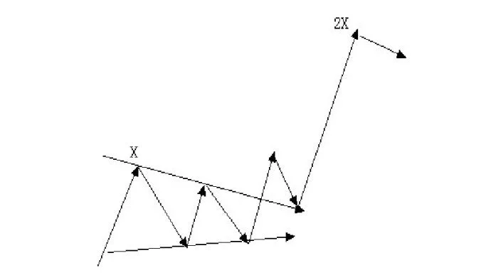 标准三角适占肥时皇将写形突破理论图形如下,还有口诀:一不涨,二不过,三突破,突破回踩确认拉主升浪,横有多宽,纵有多高,也就是翻番理论。