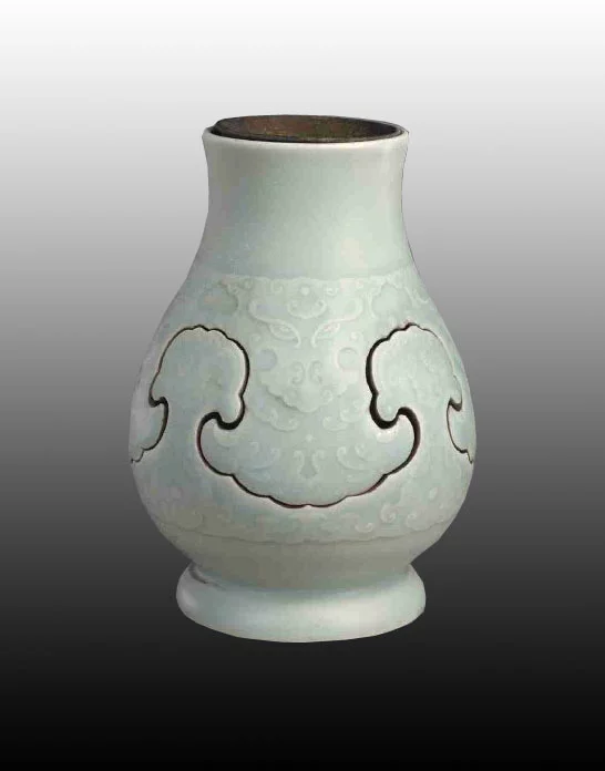 尊口外撇,短颈,溜肩,弧鼓腹,圈足跟外撇。通体施粉青釉,腹部模印兽面纹、云纹。在器腹中部采用镂雕的手法把器腹分为上下两部分,并以正、覆如意头的造型相扣,内置铜胆供插花用。外底以青花书"大清乾隆年制"三行六字篆书款。