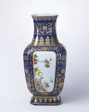 - 中文名称 清乾隆霁蓝釉描金地开光粉彩花鸟纹方瓶