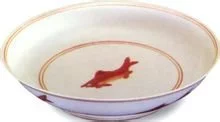 敞口,浅腹,矮圈足,口沿内外及内底和足部各饰两周红彩弦纹,并在盘心双圈内用矾红绘出一尾红鱼,外壁绘四条。胎釉洁白纯正,红色艳丽生动,图案疏密有致,层次分明,生活气息浓郁。