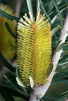 4)橙黄班克木 Banksiaprionotes Lindley(1839):灌木或小乔木,树干光滑,灰色;叶宽线形,先端圆钝,长 15 ~ 27 cm,宽 1 ~ 2cm,叶缘波状,具锯齿;顶生花序,长7~15 cm,宽7~8 cm,奶油色,边缘橙色; 样果成熟或遇火烧方养眼货才打开;花期 2 ~ 8 月。