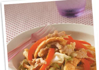 3.锅烧热,放入沙拉油,加入肉丝炒至变白,放入洋葱丝略炒,再加入高丽菜和甜椒炒软,最后加入调味料炒匀。