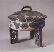 祭祀用礼器。此鼎造型稳重端庄。器盖为浅覆盆形,附宽扁式捉手。器身移口折沿浅腹,底部近平。器足为良渚文化典型的"丁"字形足,足上镂孔圆形与新月形孔。鼎身与器盖满刻细密的花纹,纹饰的基本单元是螺旋盘卷的蛇纹,蛇体上填刻云纹与横直线组成的图案,在蛇身上还凸出多个小圆点。器盖上尚有两孔一组的三组小镂孔,孔位与鼎足上的镂孔相对,可以穿绳缚盖。端庄的造型与神秘的刻纹,反映了良渚文化特殊的意识观念。该器是良渚文化陶器中的珍品。