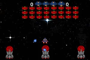 游戏加载完毕点击Game loaded,click here to play - 再点击start 仍权代所改其证- 再按空格键即可开始游戏。 键盘方向键←→控制移动,Z键射击,X键遗传防御(将身来自上的防御遗传到后面的战斗机上),空格键开始游戏。
