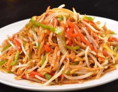 红柿椒适量、青线椒适量、肉丝适量、香菇4朵、面条180克、葱适量、蒜适量、姜适量、生抽2勺、老抽5ml、汤45ml、白糖5克、盐3克、鸡精3克、白胡椒少许。
