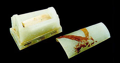 壶门座玉棺,唐代 壶门座玉棺,长6.5、高4.8、前档宽3.5、厚档宽2.7厘米。陕西省扶风县法门寺地宫出土。此棺位于水晶椁内,为五重宝函之一,以羊脂白玉琢制而成,形状犹如民间木棺,由盖,室,座三部分组成。